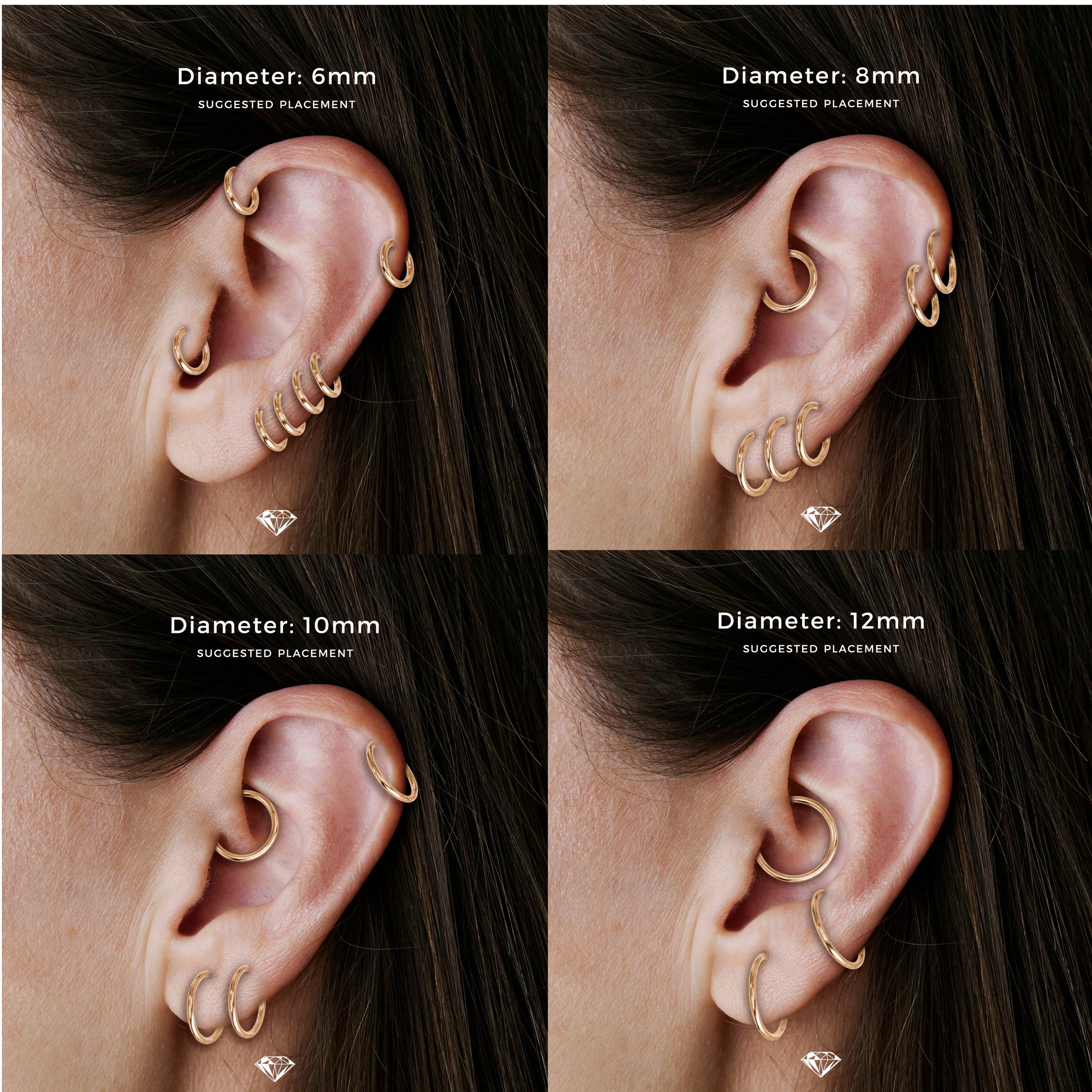 Hoop sizes are measured by their internal diameter—the space inside the ring. This measurement determines how close the hoop sits to your ear or piercing.